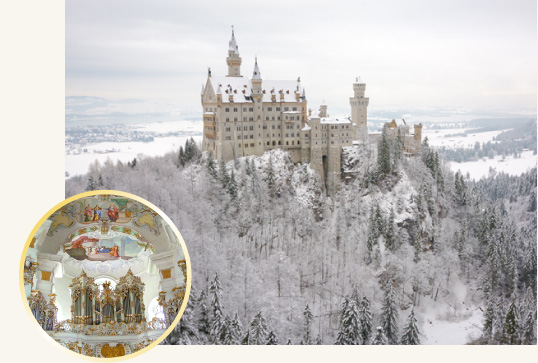 壮大な森や湖の広がる美しい風景の中に、優雅にそびえる「ノイシュヴァンシュタイン城」。「白鳥城」という意味を持つこのお城は、冬になるとまさに白鳥の様に雪で白く染まり、幻想的な姿を見せてくれます。ディズニーランドのシンデレラ城のモデルにもなったと言われる白亜の城は、数あるドイツのお城の中で一番の人気です。 ノイシュヴァンシュタイン城入場見学の後は、ドイツが誇る巡礼教会「ヴィース教会」へ。宗教的にも芸術的にも価値があり、世界遺産に指定されています。この教会の見どころは内部。ロココ教会建築の最高傑作と言われる絢爛豪華な装飾は見るものを圧倒します。「天から降ってきた宝石」とも讃えられる天井画は、一見の価値ありです!