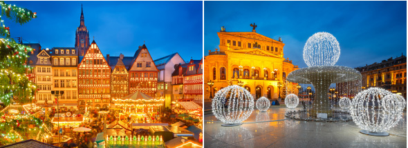 ドイツ旅行の玄関口「フランクフルト」と「ミュンヘン」。クリスマス・シーズンは街中がイルミネーションで輝き、一年で一番美しい季節です。両都市とも伝統的なクリスマス・マーケットが開催されますので、滞在中はクリスマス・マーケットや観光をご自身で自由にご堪能ください!