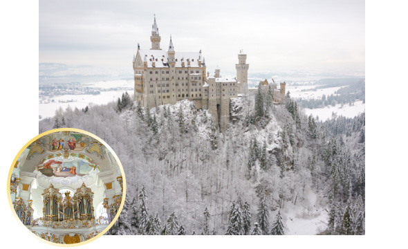 壮大な森や湖の広がる美しい風景の中に、優雅にそびえる「ノイシュヴァンシュタイン城」。「白鳥城」という意味を持つこのお城は、冬になるとまさに白鳥の様に雪で白く染まり、幻想的な姿を見せてくれます。ディズニーランドのシンデレラ城のモデルにもなったと言われる白亜の城は、数あるドイツのお城の中で一番の人気です。