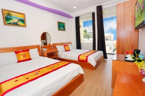 ベトナム航空は機材は古かったものの、機内食のパンが美味しかったですし、サービスも良く概ね満足です。台北乗り継ぎで、ニャチャンには夕方頃到着しました。今回の旅の滞在先は「グリーンホテル ニャチャン」。ニャチャン の中心部にあるのでとても便利でした。またビーチも徒歩3分ほどという好立地でした。ホテルの向かいにはショッピングモールもあり何かと便利で良かったです!お部屋も概ね良し。英語も通じましたしスタッフの対応も親切で良かったです。朝食も美味しかったです。卵焼きなど、その場で作って下さいました。