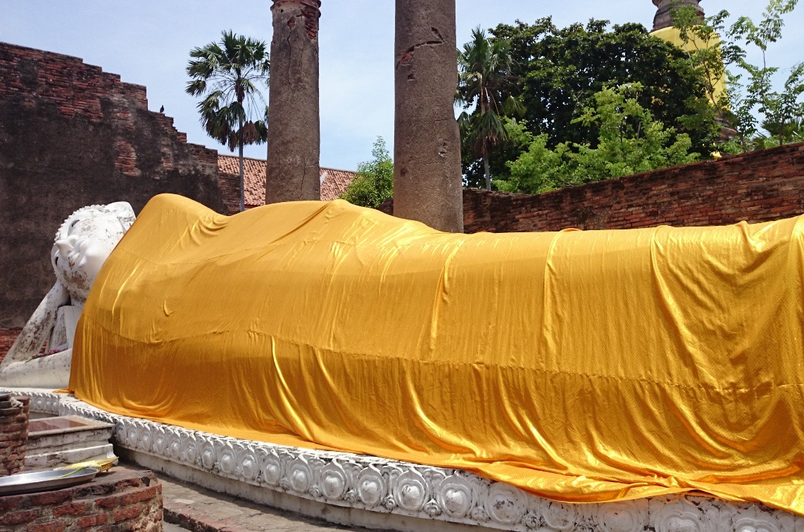 ワット・ロカヤスタの巨大涅槃仏は金の布を何枚も掛けご利益を得るそうです。