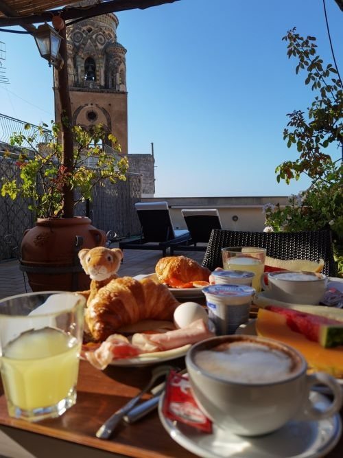 この日は朝から鉄道で、ローマ・テルミ二駅からナポリへ移動。アマルフィへ到着したのは午後お昼過ぎ。天気がよくて海も綺麗で最高!想像以上に素晴らしかったです。この日は、海を見てゆっくり過ごしました。御社に取って頂いたホテル「アルベルゴ ランティコ コンヴィット(Albergo L'Antico Convitto)」は、お部屋から海が見えて最高すぎました!!!リクエスト頂いたお部屋はとても広くて居心地がよかったです。