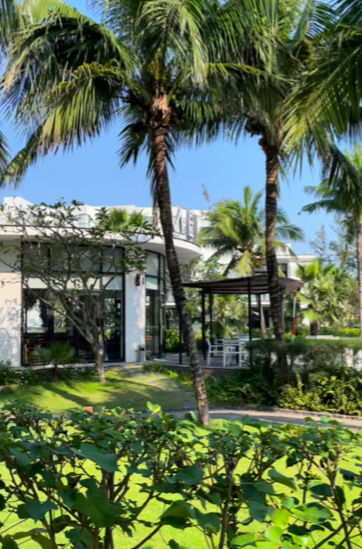 成田空港発、ホーチミン経由でダナンへ。今回はベトナム航空を利用しました。スタッフの方も親切で機内食も美味しく、サービスもよかったです。ダナンには夕方過ぎに到着しました。今回の滞在先ホテル「メリア ダナン ビーチ リゾート(Melia Danang Beach Resort)」に到着。到着すると、スーペリアの予定でしたが、もっと良いお部屋をご用意させていただきましたと、2階建てのレベルルームにグレードアップしてくれました!上から見るとプール周りのコテージです。レストランもどこもリーズナブルなのに美味しく、目の前にはプライベートビーチ。プールもご飯も何もかもが最高でした。初日は夜にホテルに着きましたが、夜のプールも雰囲気があってすごく良かったです。