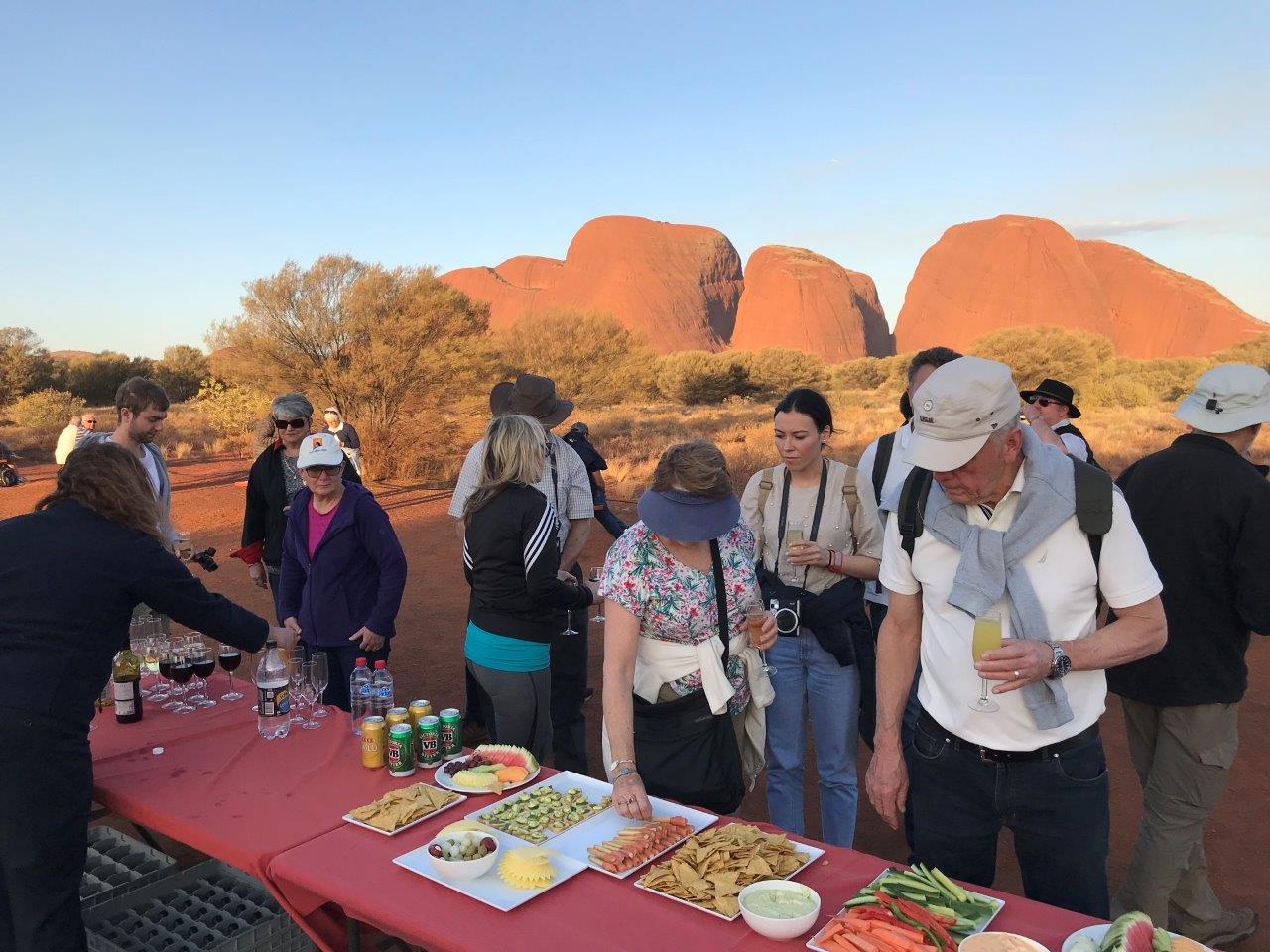 お昼にはウルルからホテルへ戻りました。午後は英語のサイトから申し込んだカタジュタサンセットツアーに参加。16時半にホテルまでピックアップがあり、カタジュタのビューポイントをみて、サンセットを見るという内容でした。サンセットを待つ間に自然の中でスパークリングワインやおつまみが出てくるのですが、これはうっとりするほど贅沢な時間でしたね。